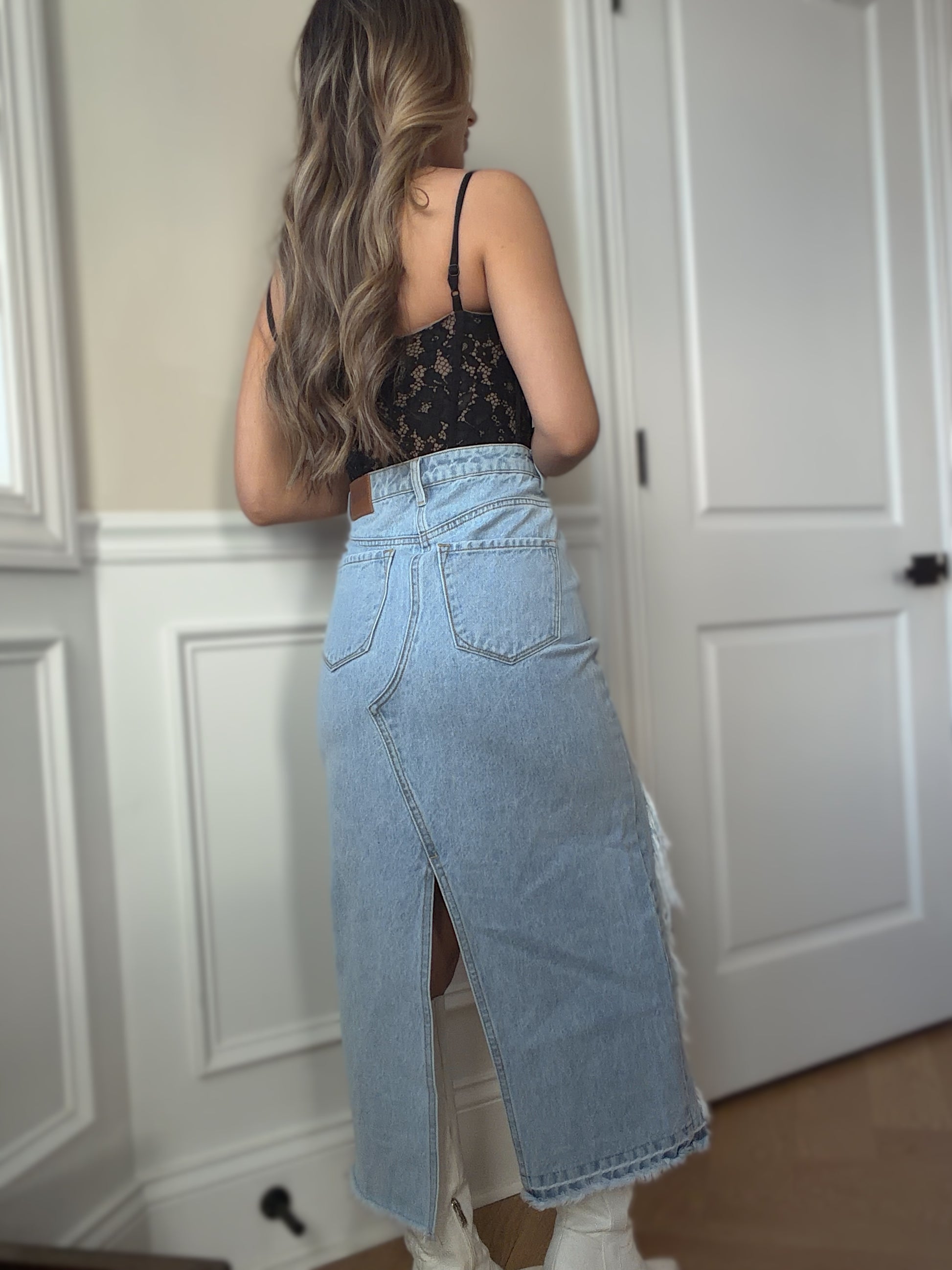 PREORDER: Harper Heavily Distressed Denim Maxi Skirt