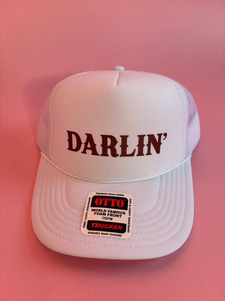 A high-profile western-style trucker hat featuring a foamed front panel with the bold text “DARLIN'”—perfect for making a statement