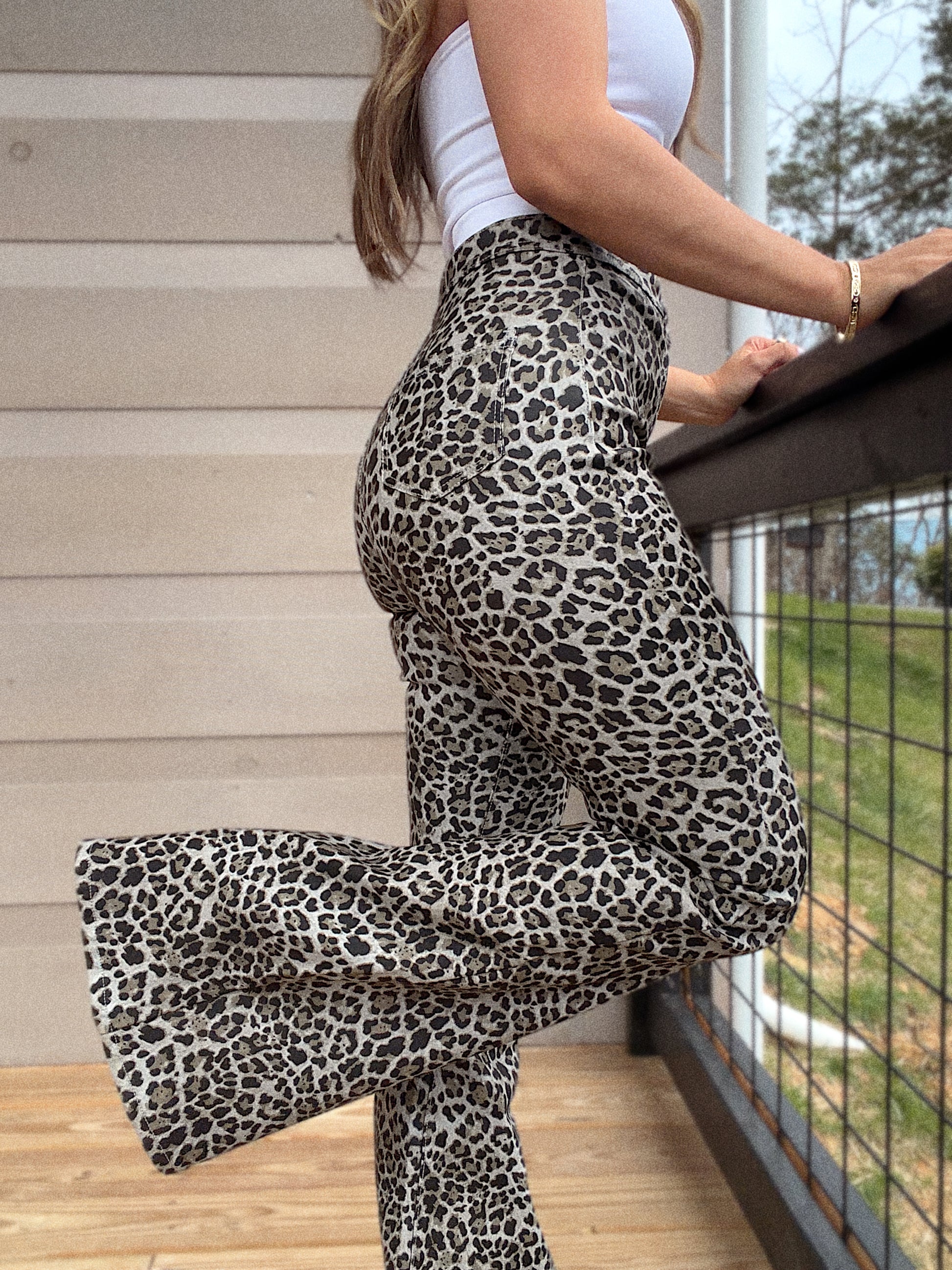 PREORDER: Fiona Leather Leopard High Waisted Bell Bottom Flare Jeans - Grey Moonstone Leopard
