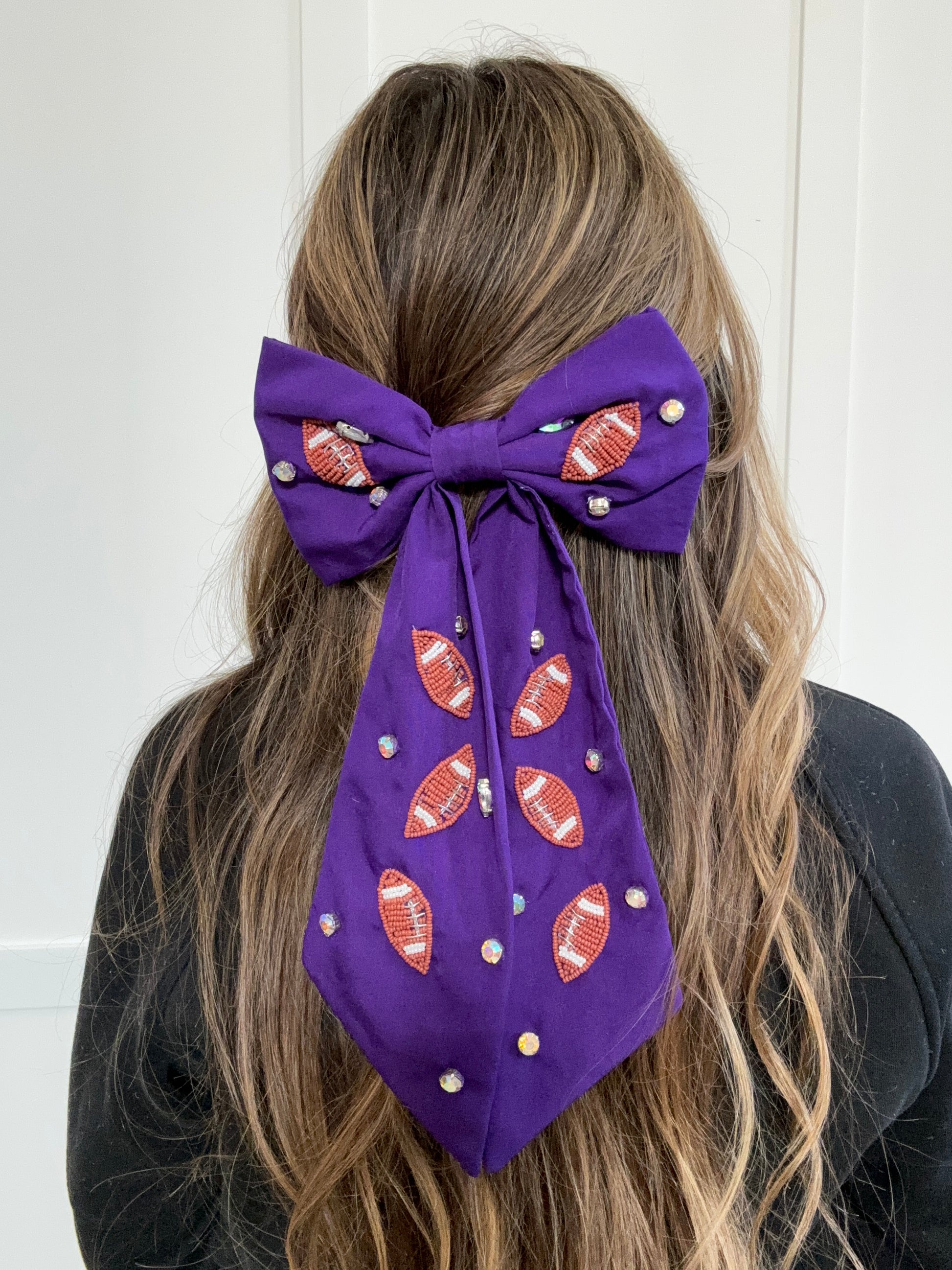 Add some flair to your game day look with our Game Day Football Bow Barrette Hair Clip! Featuring a football graphic and beaded embellishments, this hair clip is perfect for any football team. The height of 12.5" and width of 6.5" make it the ideal accessory for game day. Go team!