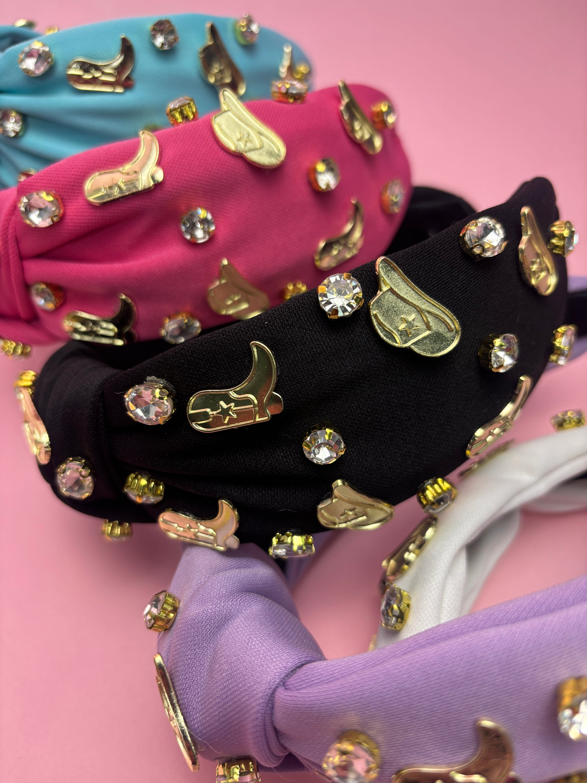 Add a little western sparkle to your look with our Golden Rodeo Knotted Headband! Each headband features a soft, padded fabric design adorned with charming western-inspired details like cowboy hats, boots, and rhinestone accents for the perfect mix of cute and glam.