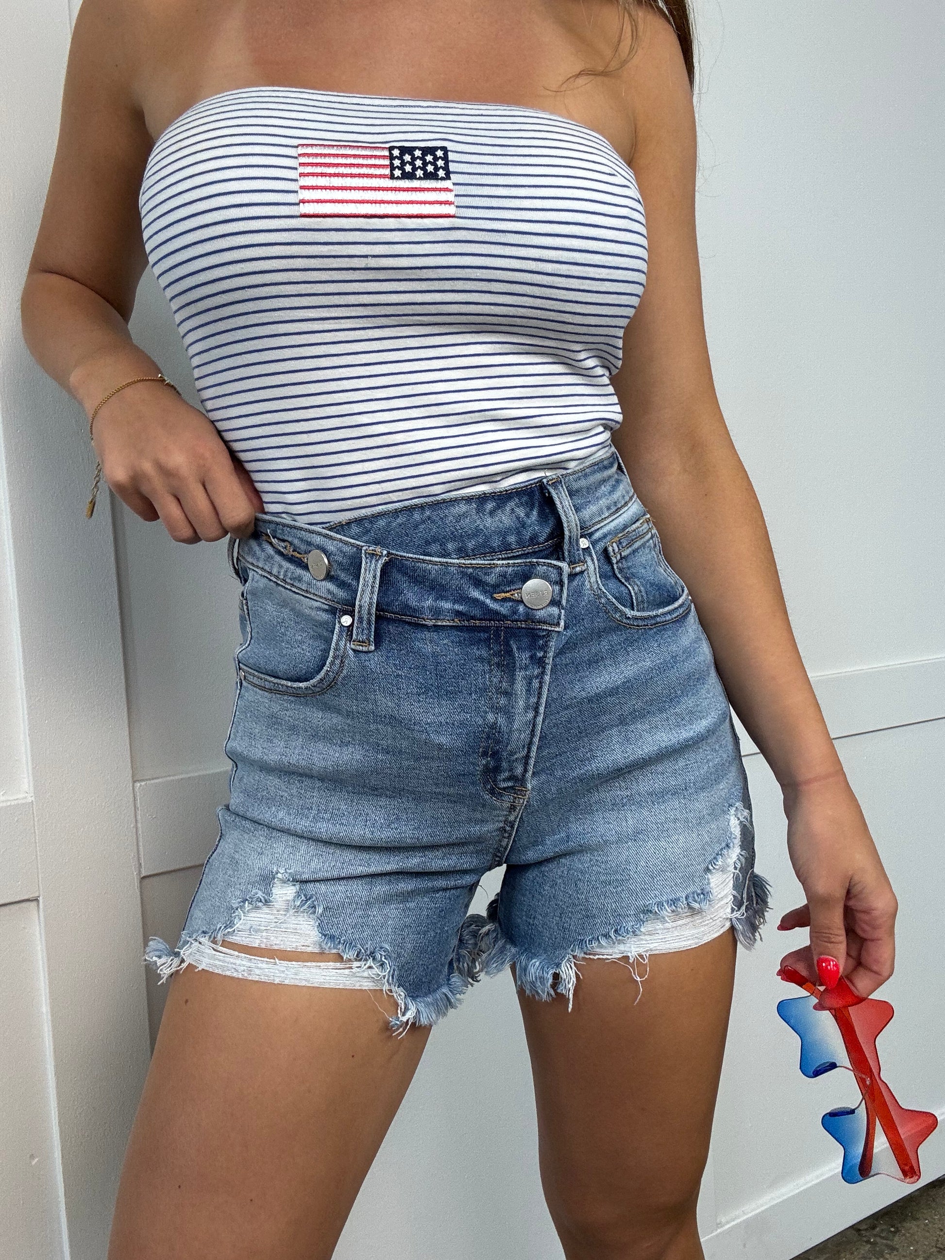 Step into summer with these trendy distressed shorts, designed with a unique asymmetrical button detail and high waisted fit for the perfect mix of edgy and flattering. With a secure two-button closure and functional pockets for all your essentials, these shorts are a warm-weather must-have.