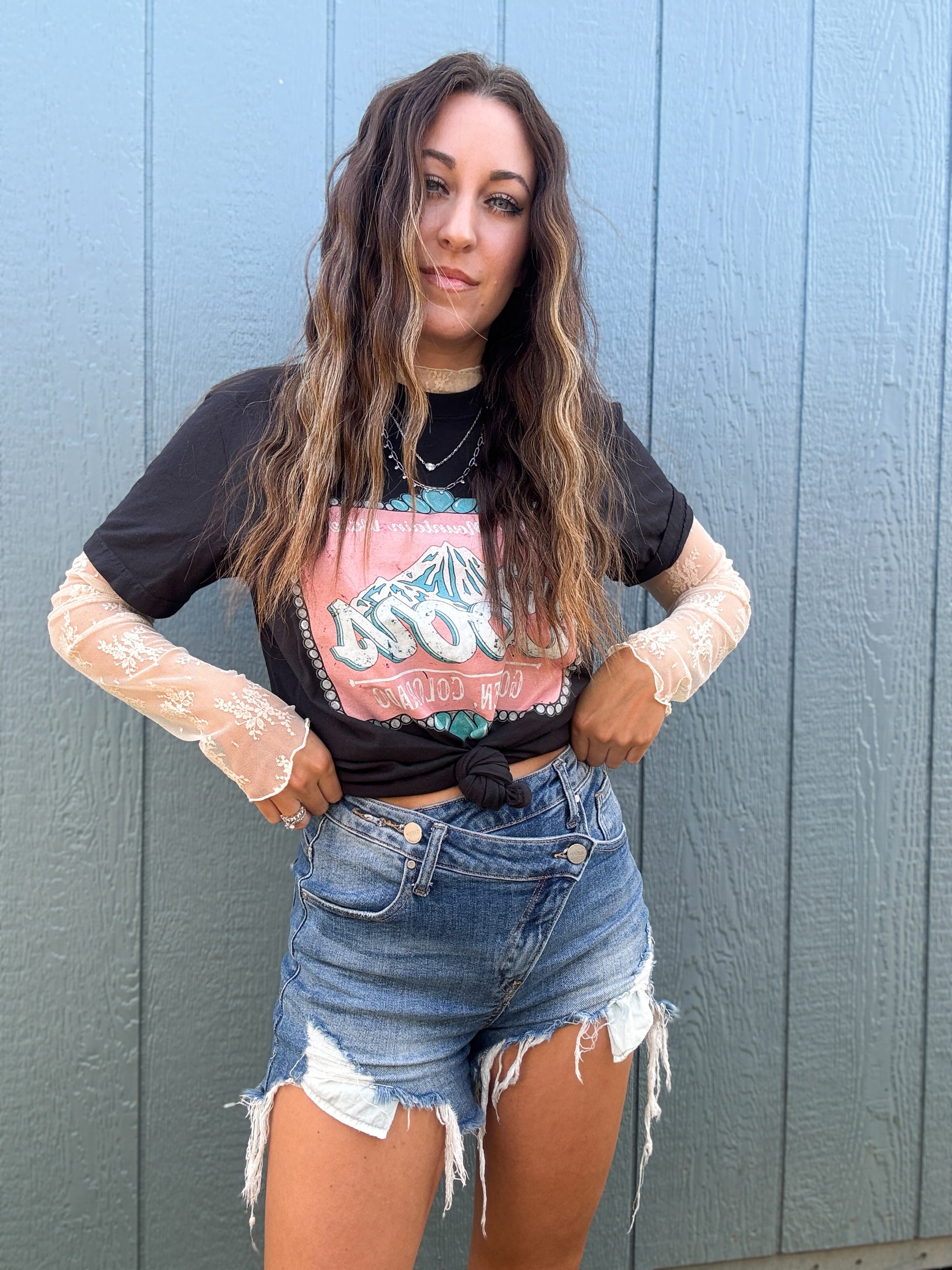 - Distressed denim shorts