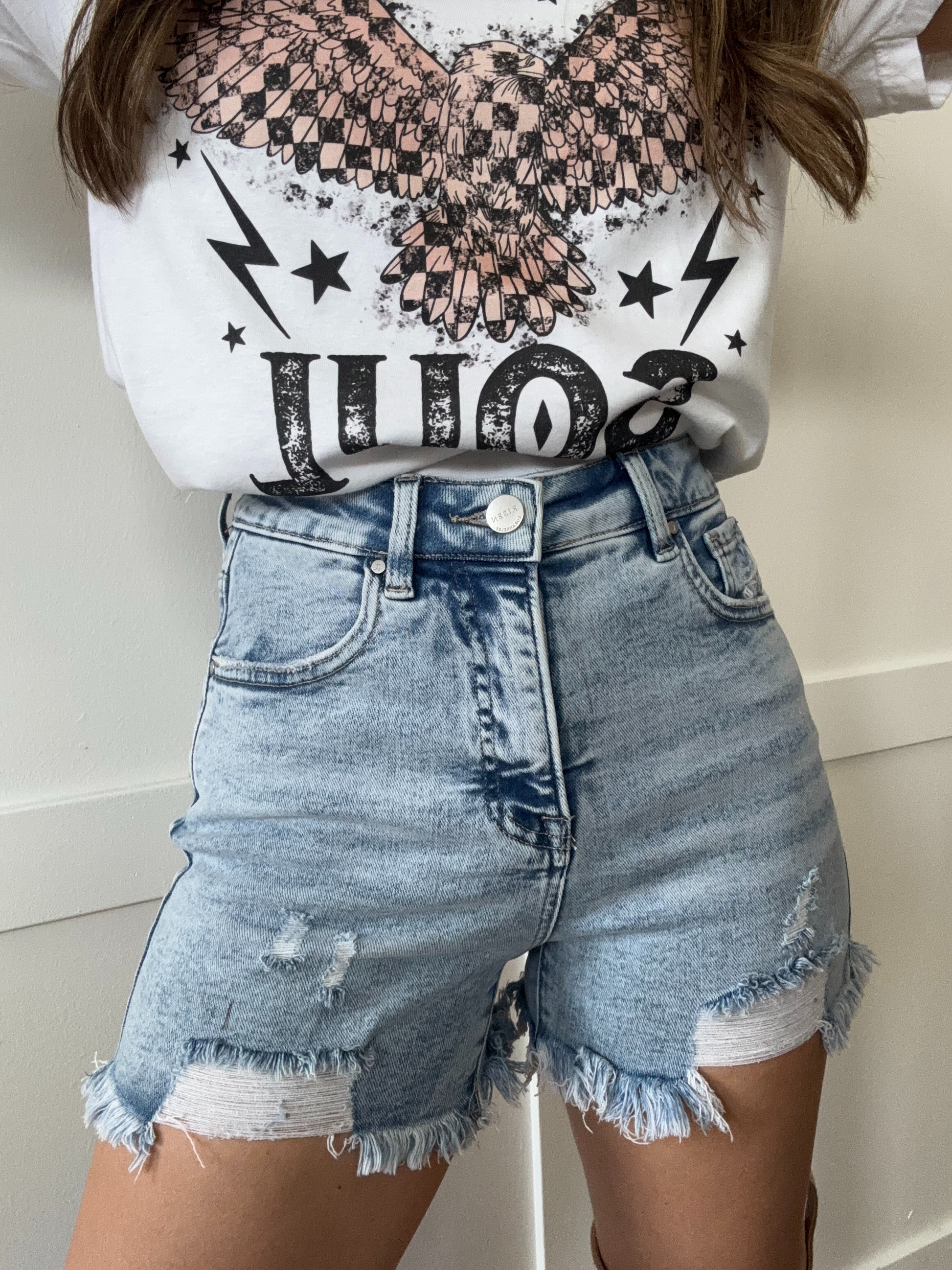 Keep your style on the rise with these medium acid wash high rise shorts from Risen! Featuring trendy distressing at the hem and crafted from stretchy cotton denim, these shorts are perfect for festivals, road trips, or any on-the-go adventure. Designed with front and back pockets plus a secure zip + button closure, they’re as practical as they are stylish.