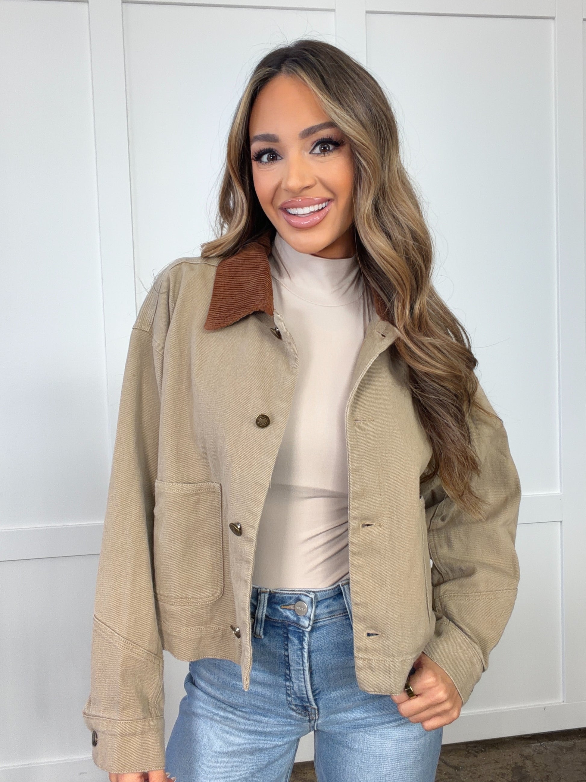 Make a fashion statement with this cotton twill cropped barn jacket featuring a stylish collar. The durable cotton twill fabric offers both comfort and durability, perfect for transitional weather. The cropped length adds a modern touch to the classic barn jacket silhouette. Complete with a collar, this jacket exudes a chic and polished look. Pair it with jeans and a t-shirt for a casual daytime outfit, or layer it over a dress for a more sophisticated ensemble. Elevate your outerwear collection with this fashionable and versatile cotton twill cropped barn jacket.