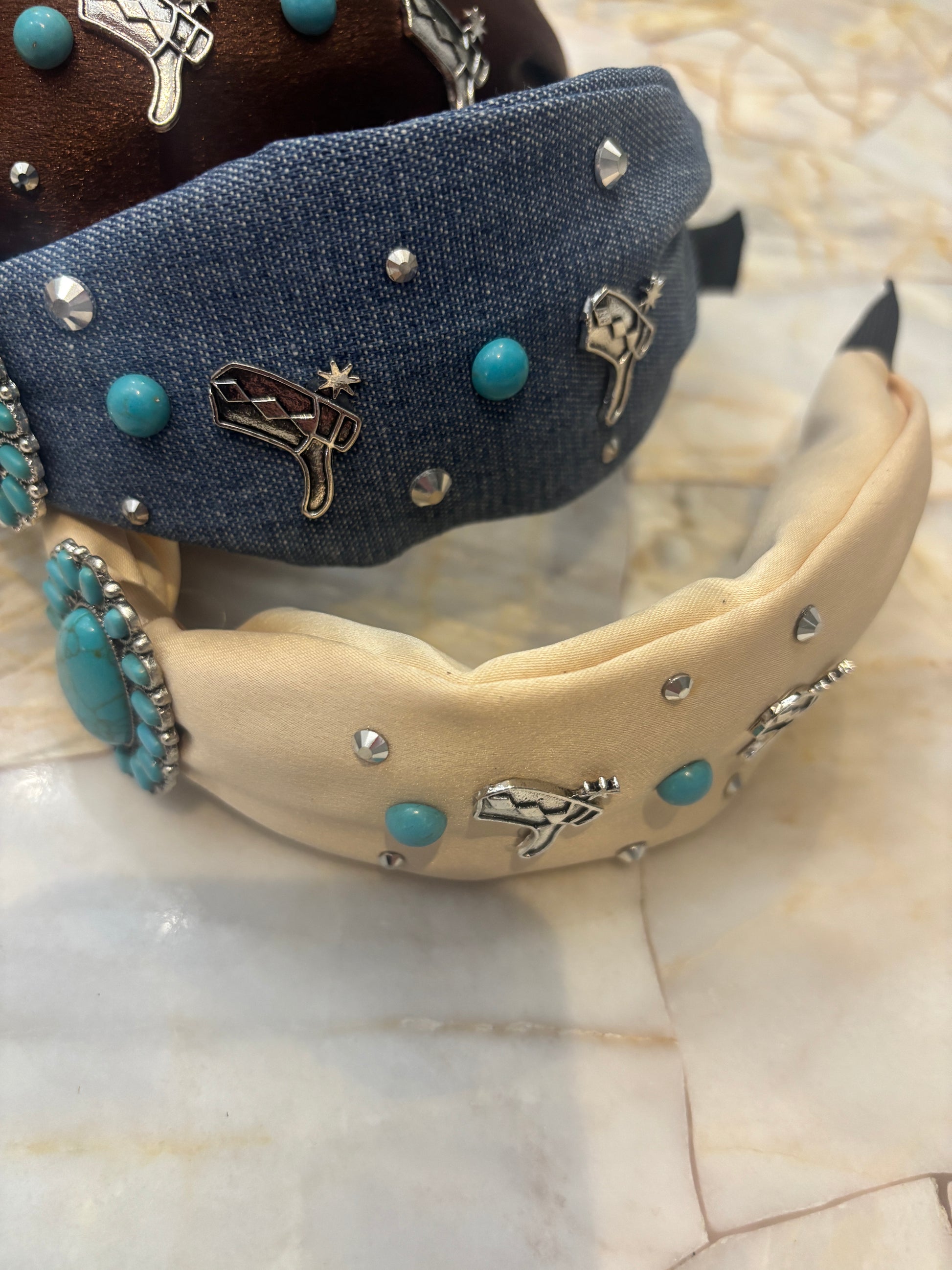 Add a little western sparkle to your look with our Western Turquoise Top Knotted Headband! Each headband features a soft, padded fabric design adorned with charming western-inspired details like cowboy hats, boots, and rhinestone accents for the perfect mix of cute and glam.